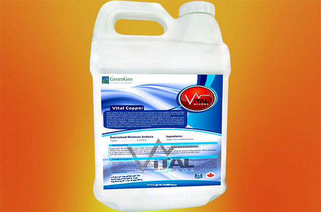 VITAL COPPER (4%) is a specially formulated foliar fertilizer by using AgriSol’s proprietary ERMP technology to help prevent and quickly correct Cu deficiencies. VITAL COPPER (4%) is made with chelated sources of COPPER andorganic acids. It ensures steady supply of Copper. It can be used in greenhouses, open field, throughdrip/drench and foliar applications.